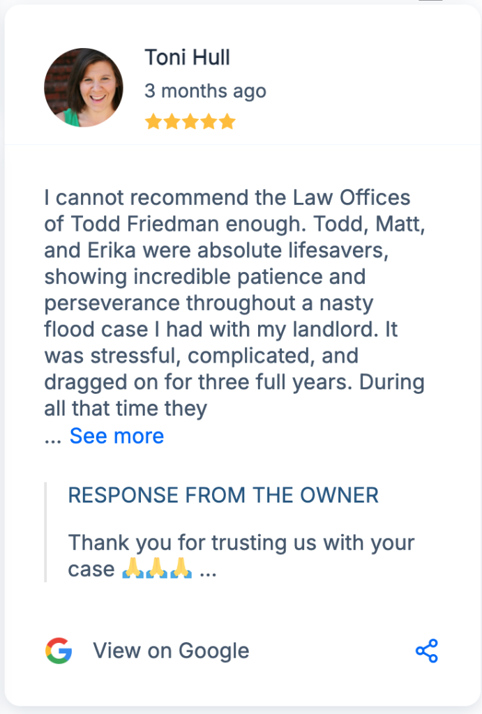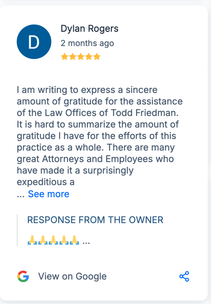 Speak directly with attorney Todd Friedman about your case. Todd will evaluate your situation and provide prompt and straightforward feedback, saving you time and alleviating uncertainty.